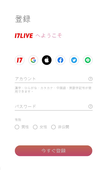 17ライブの登録は他のアプリと関連付けて登録することができます。新しい名前で登録したい方はIDを新しく作成して登録することをおすすめします。